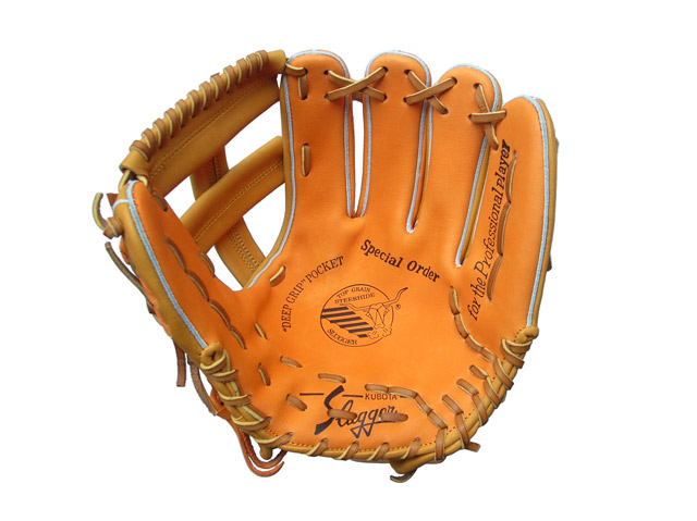 言わずと知れた名グラブ【L5】の折り返しを無くした【本多モデル46SEU】をベースモデルに採用しました。大きさはショート用くらいです。