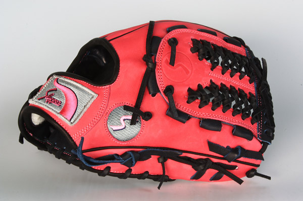 ショート(内野用)グラブ。捕球面折り返し無しモデルKSN−46SEUを基本形にピンクとKSブラックの対照色でまとめました。外側は派手なのに内側は地味というコントラストが非常に楽しいグラブです。人気のアミアミバスケットウェブW−18採用でさらにGOODです! 右投げ用3個での販売です。ぜひご検討下さいませm(_ _)m