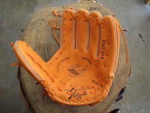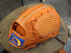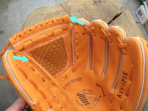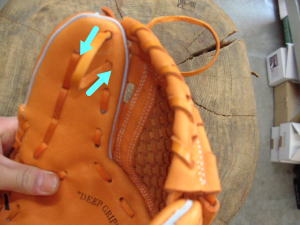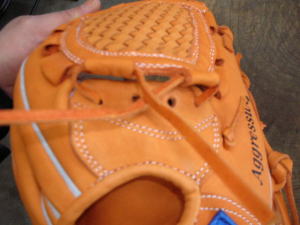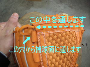 上のヒモをグラブ捕球面側2番目の穴から背面に出します。そのヒモをウェブとグラブを編みこむように通していきます。 |