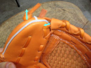 次に、ウェブ上部を取り付けますがW-27と縫い方が違いますのでご注意下さい。指先からのヒモをウェブ背面側1番目の穴から出します。それをウェブ捕球側2番目の穴に入れ、ウェブ背面側3番目の穴から出します。その要領で1個飛ばしで縫っていきます。最後は親指背面側最上部の穴から捕球面側最上部の穴に通します。 |