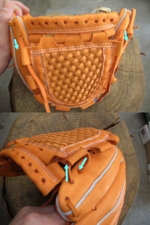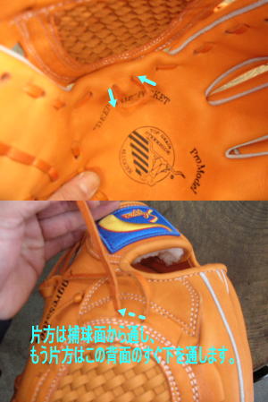 片方のヒモは捕球面側から通し、もう片方は捕球面と背面の間の空間を通します。 |