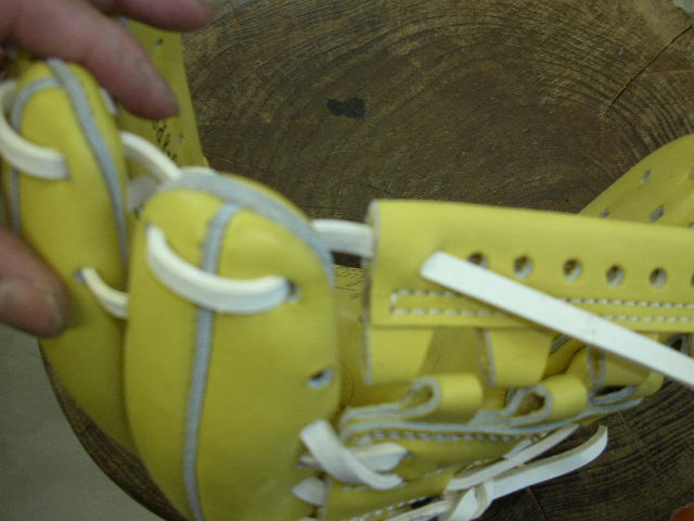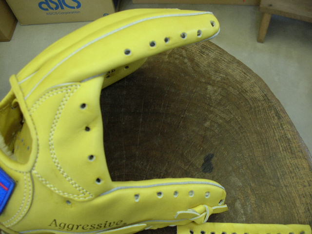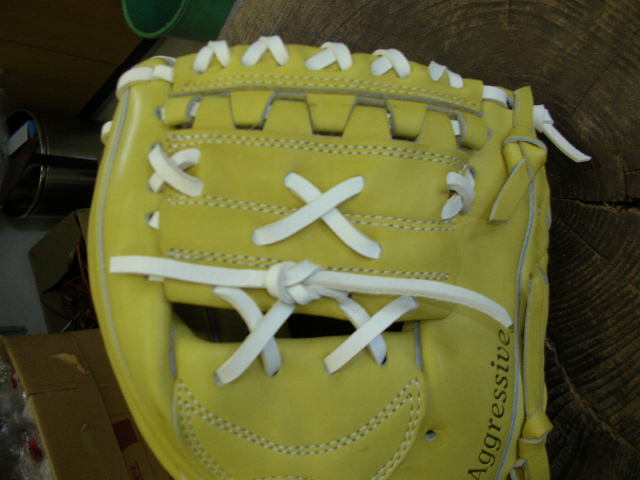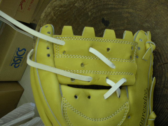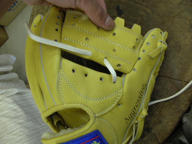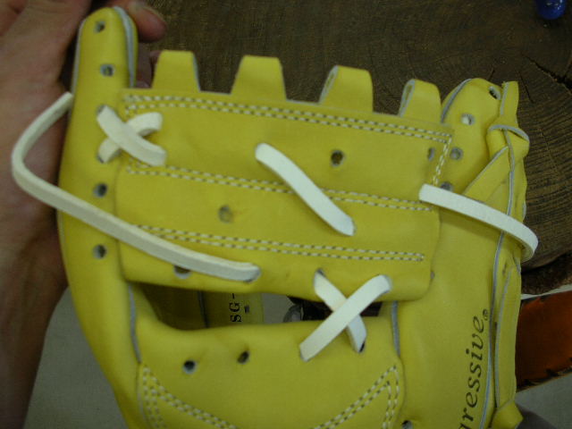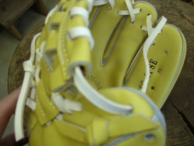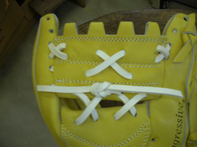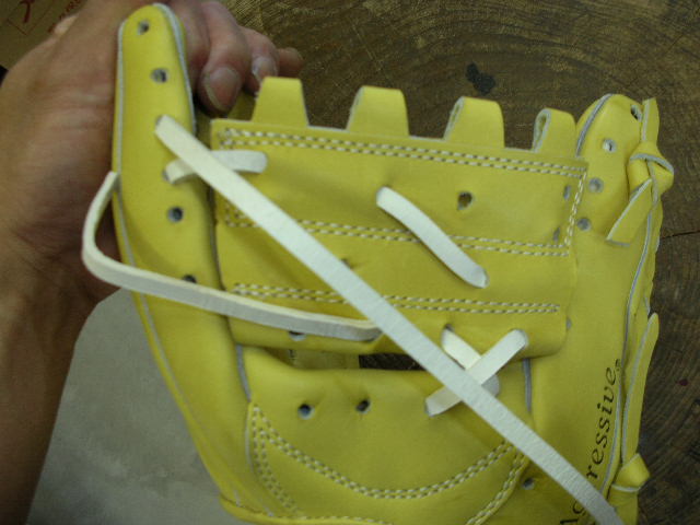 そのヒモを順にクロスして編んでいき最後は親指最上部捕球面側から背面側へヒモを出して、ウェブ装着完了です。 |