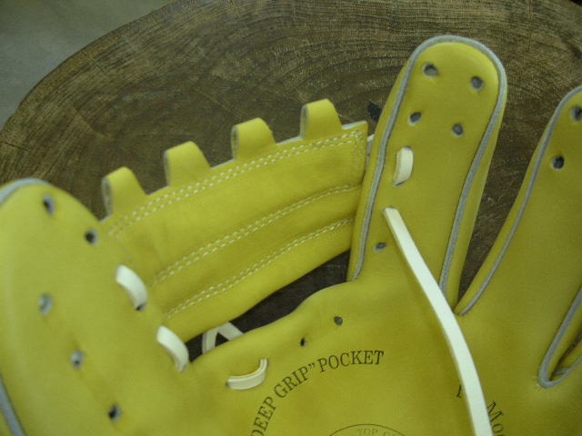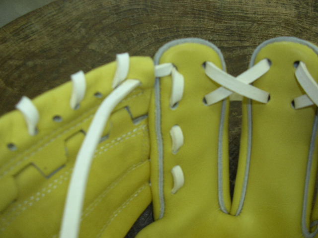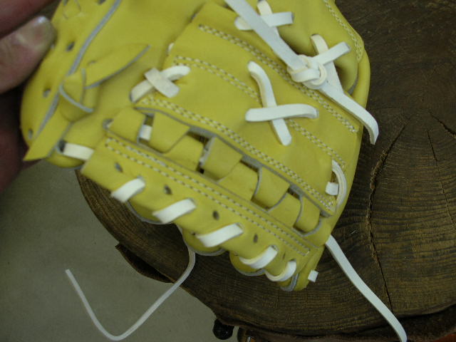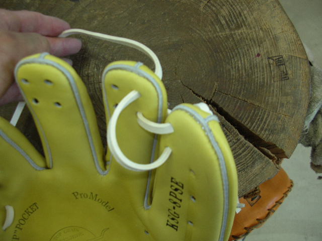 指先からのヒモをウェブ背面側1番目の穴から出します。それをウェブ捕球側2番目の穴に入れ、ウェブ背面側3番目の穴から出します。その要領で1個飛ばしで縫っていきます。最後は親指背面側最上部の穴から捕球面側最上部の穴に通します。 |