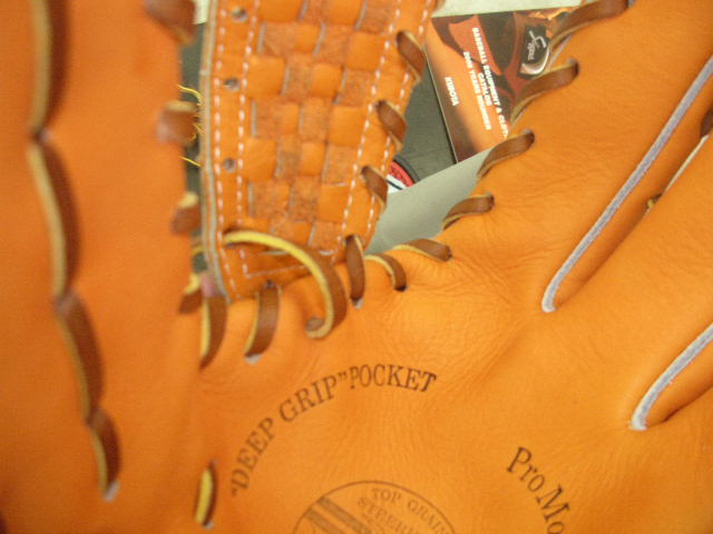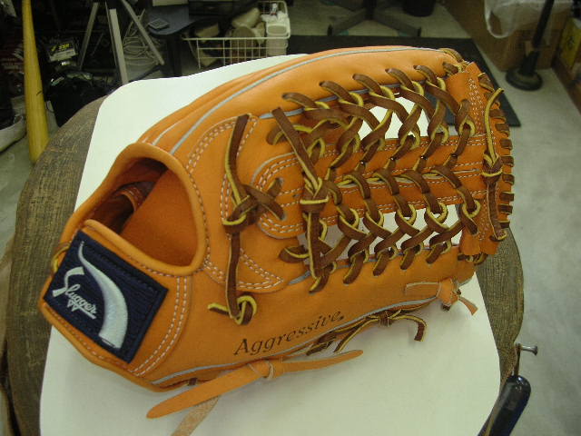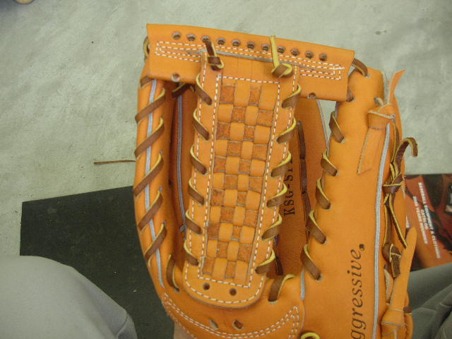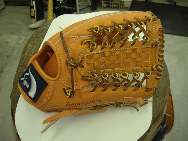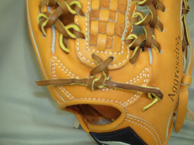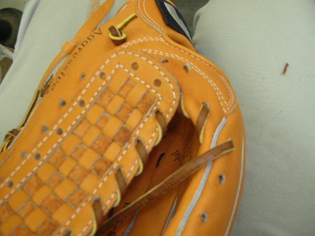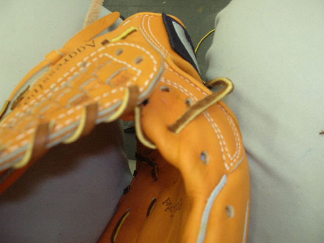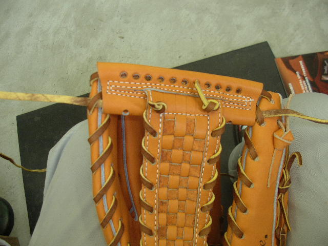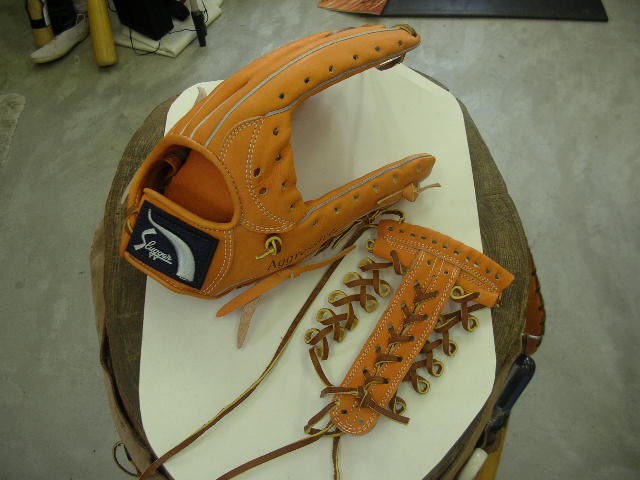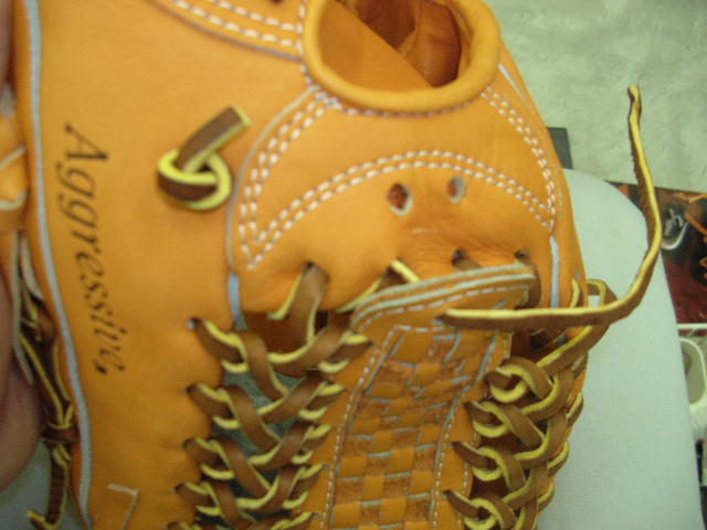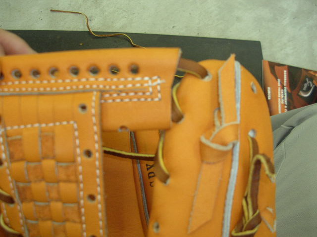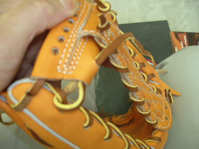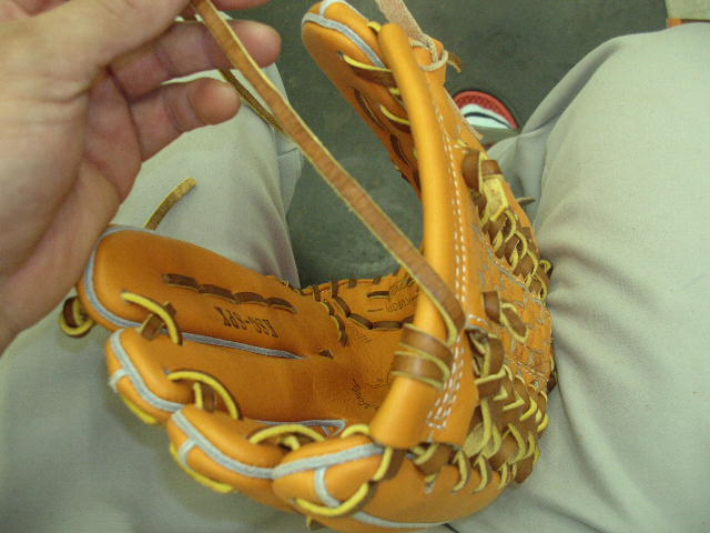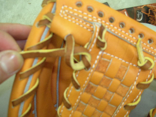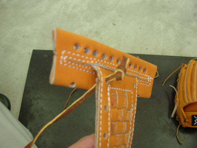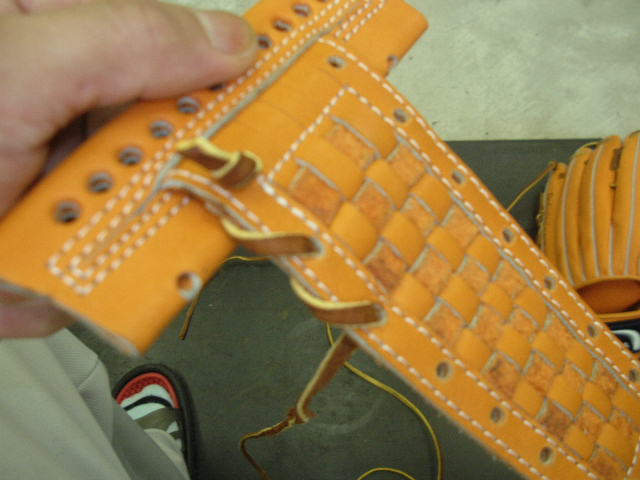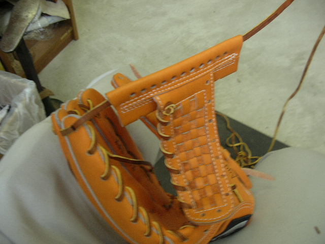 ウェブの下から2番目の穴の捕球面側まで縫った状態でグラブとウェブを装着します。そしてそのまま指先へと巻き巻きしていきます。 |