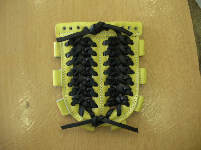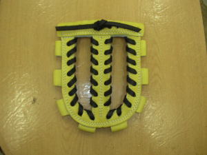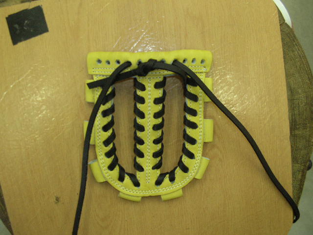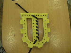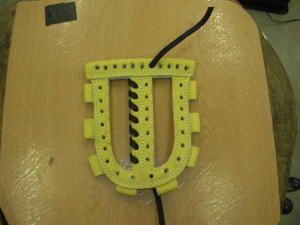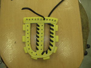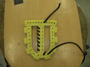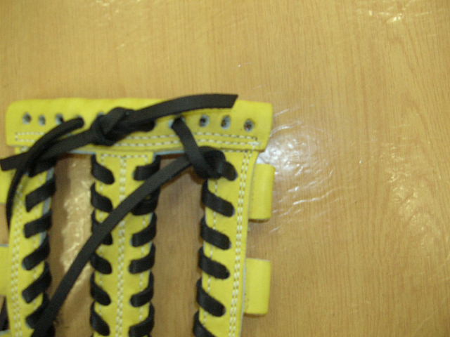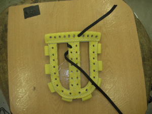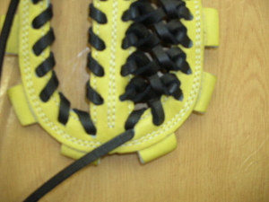 | 今回は1番人気のウェブ【W−3】のヒモ交換について説明します。写真はヒモを取り付け始めた状態です。天穴中央1個横からスタートします。 |