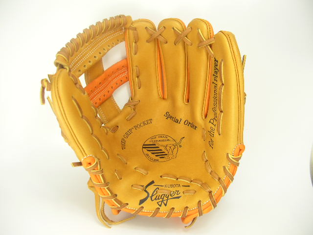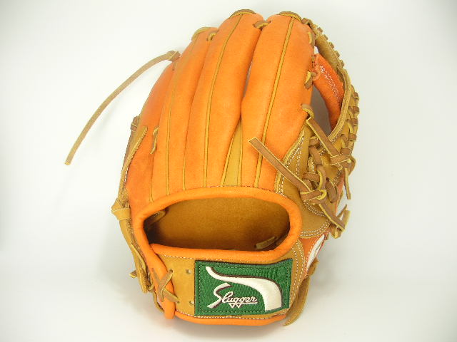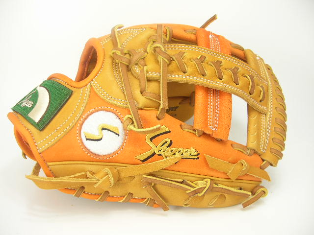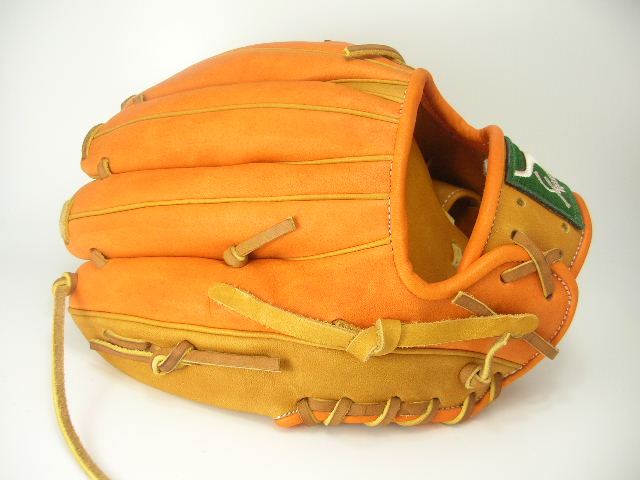 | 今回のオーダーグラブはKSN−L7SベースのW−14タン×KSオレンジカラーモデルです。セカンド・ショート・サード、内野ならオールラウンドに使えるL7Sを基本モデルに選択しています。カラーリングは人気の2色KSオレンジとタンの同系色同士を合わせました。丸抜きのホワイトとラベルのグリーンがアクセントになり非常に綺麗なグラブです。それでは型付けを無料サービスさせていただきますのでこの機会に是非宜しくお願い致します。 |