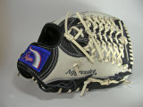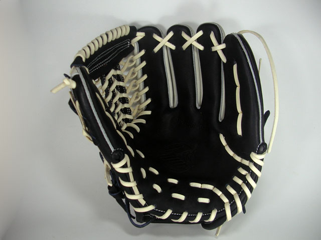 当店オリジナルオーダーグラブで基本形はKSN−L7Sです。久保田スラッガー特有のネイビーとブラックの中間カラーであるKSブラックとホワイトの本体・ヘリ皮にホワイトの皮ヒモ・ハミ出しでラベルは今年の新アイテムCラベル(ブルー×ライトシルバー)です。同時販売のL5同様夏にぴったりのグラブです。